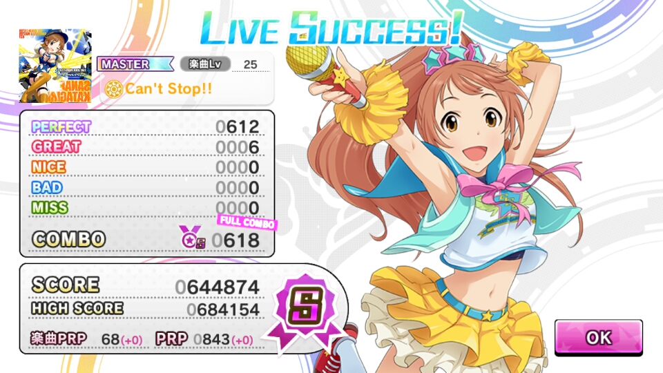 - #デレステ Can't Stop!! MASTERフルコンボ。最初「これリズム難な譜面だからスピード上げるほうがいいな」と思ってたのだが、やってるうちに視認難のほうが厄介だと気づいてスピード下げた。 [twipple]
