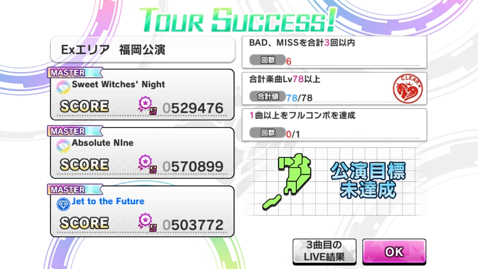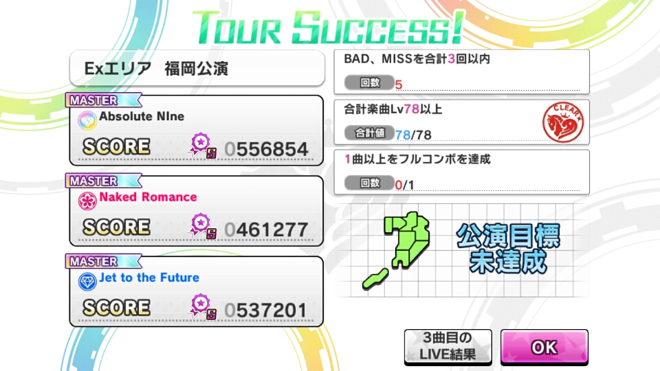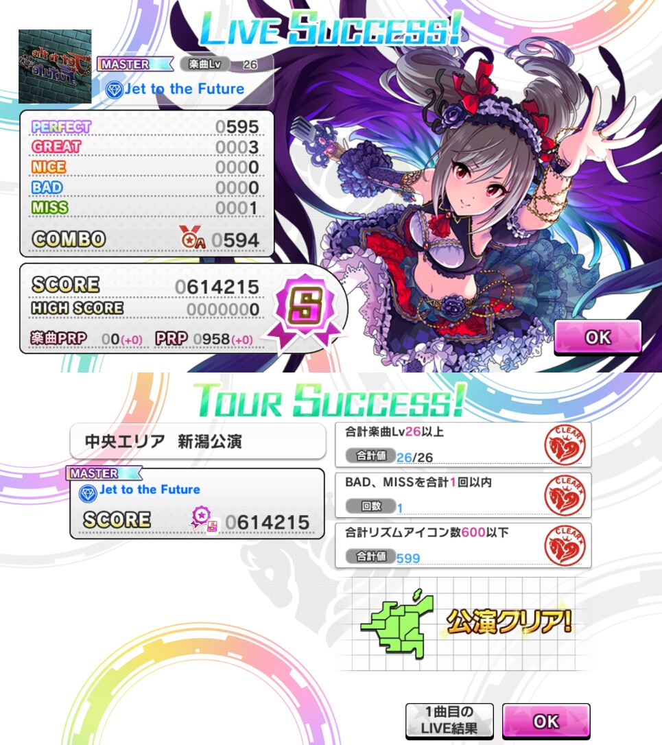 - #デレステ 新潟公演(1曲、Lv26以上、600ノーツ以下、BAD/MISS1つ以下)は2回目の挑戦で突破。ちなみに、今回のイベントで結構回してるJet to the Future(599ノーツ)を選んだ。 [twipple]
