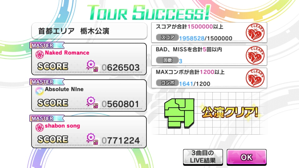 - #デレステ 栃木(3曲、スコア150万以上、BAD/MISS5回以下、コンボ1200以上)は一発で突破。アブナイで不用意なことやらかしてこれまずいかも…と思ったが、shabon songをフルコンできたのでよかった [twipple]