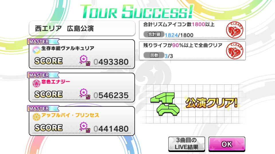 - #デレステ てことで、福岡以外の公演で埋めてないものを、なるべく(自分にとって)腕の疲れない曲で埋めていくことに。三重を一発クリア。 [twipple]