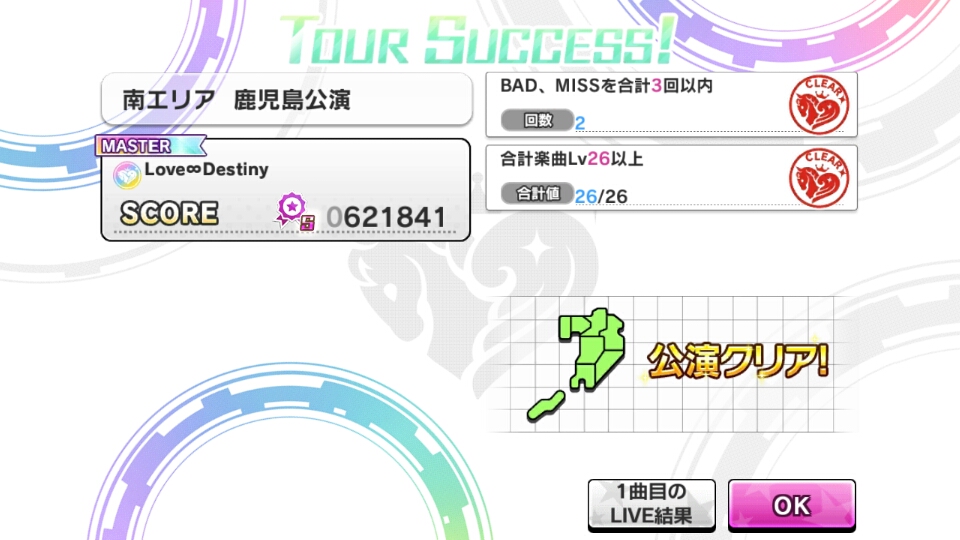 - #デレステ 鹿児島(1曲、Lv26以上、BAD/MISS3個以下)を一発で突破。この条件で、なるべく腕が疲れないもの…って考えた結果がラブデスだった。フルコン狙いじゃまず選ばないぞ [twipple]