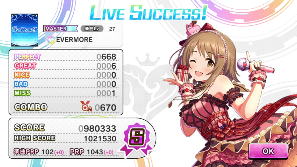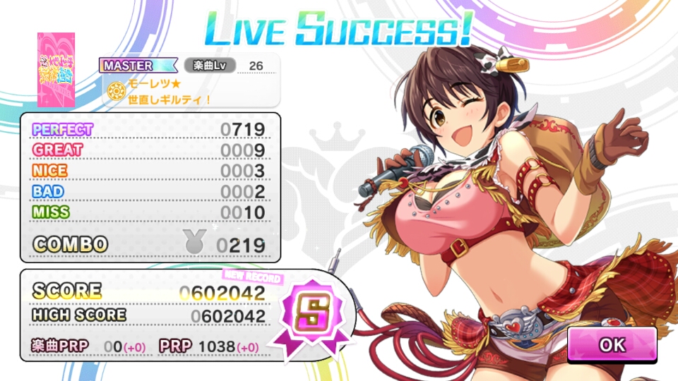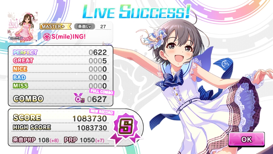 - #デレステ S(mile)ING! MASTER+、NICE以下が1個というのをもう10回近くやっていて、ようやくフルコン取れた。明日でMASTER+が切り替わってしまうので、その前に取っておきたくて結構な回数回してた。
